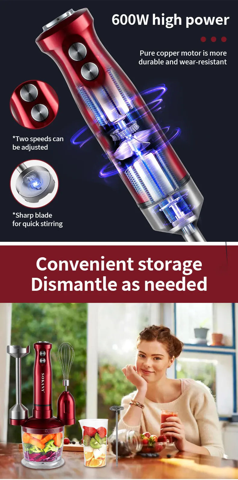 Electric Immersion Blender Hand Blender with Whisk 5 in 1 600W,304 Stainless Steel Ice Crush Blade with Whisk, Milk Frother