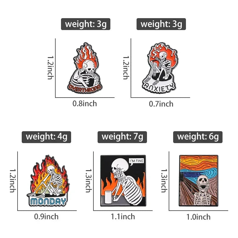 Halloween Skeleton Oil Painting Design Enamel Pins I'm Fine Anxiety Overthiking Skull Brooches Lapel Badge Punk Jewelry Gifts