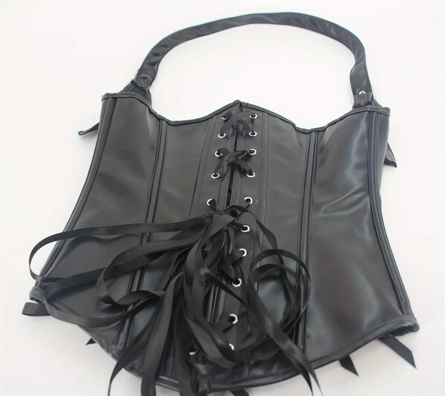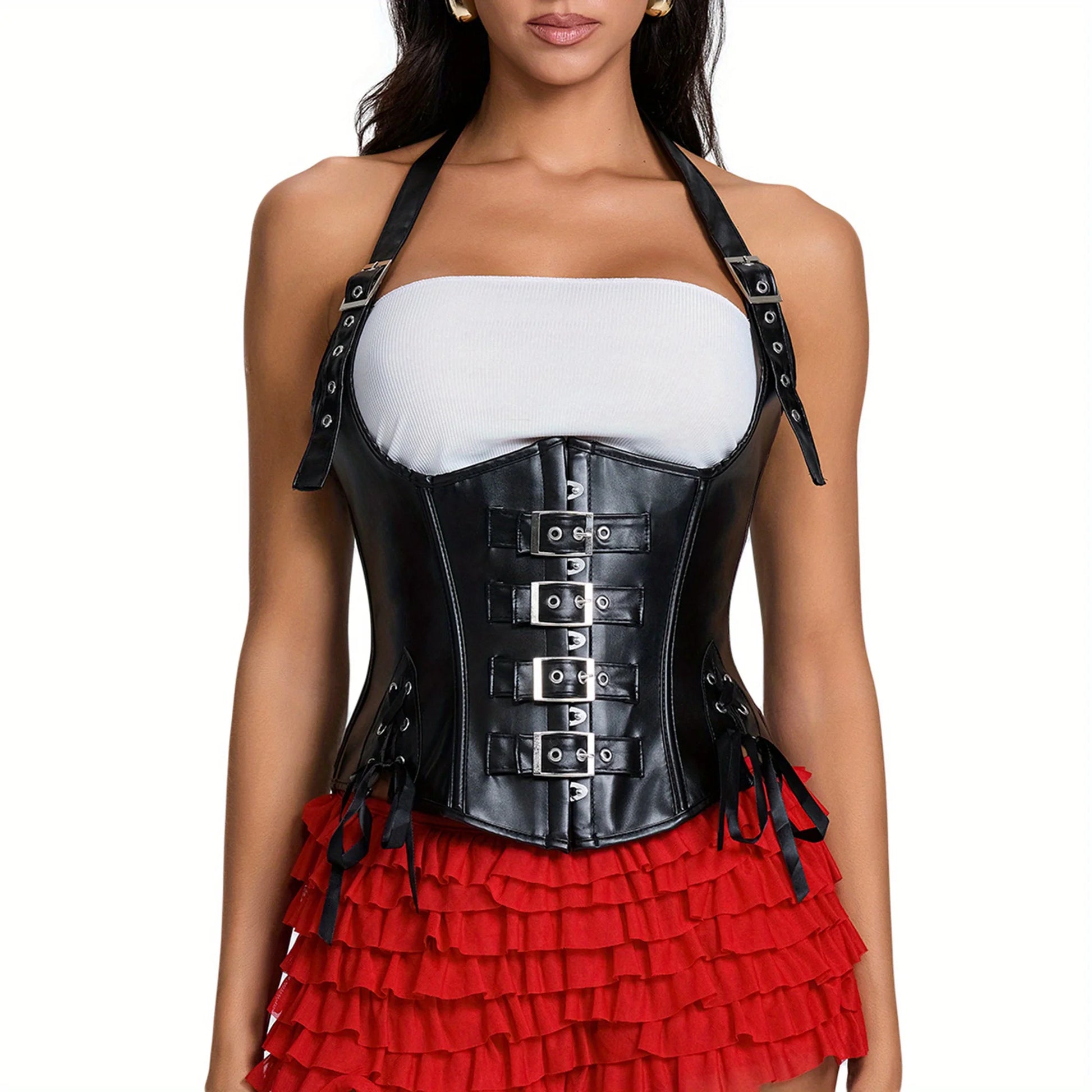 PU Leather Corset Sexy Steampunk Corset Top Halter Corselet Shapewear Women Tummy Control Bustier Lace Up Halloween Costume